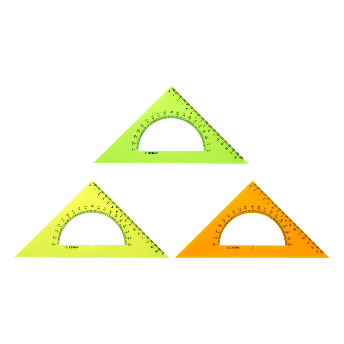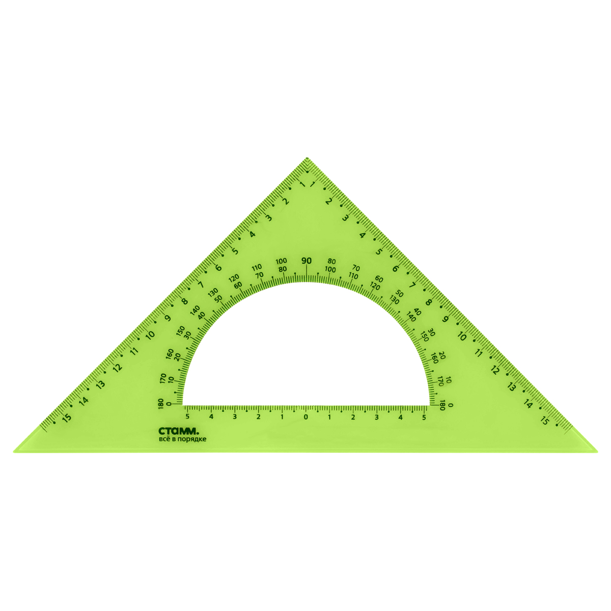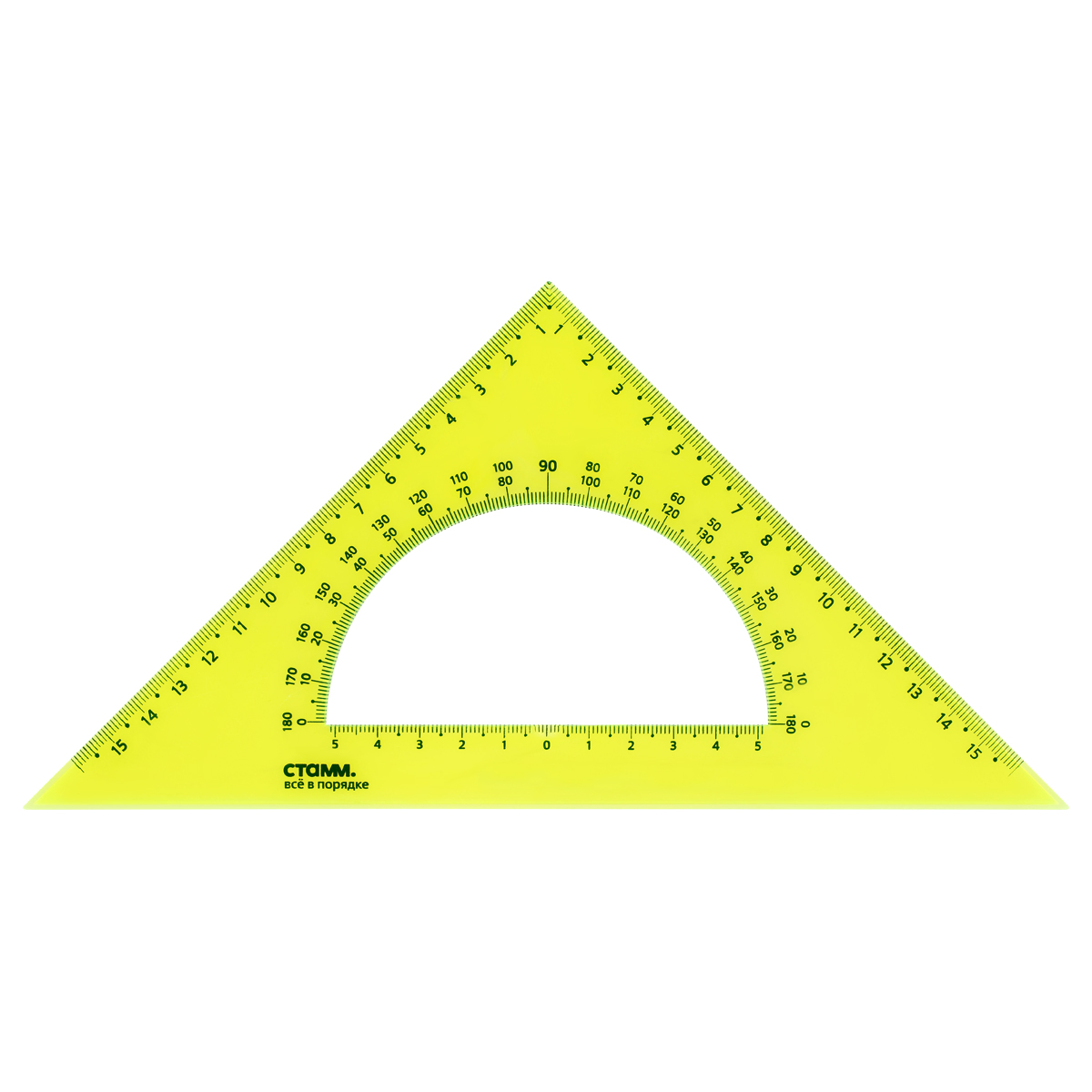Треугольник СТАММ Neon Crystal с транспортиром – незаменим для чертёжных и измерительных работ. Угол изделия – 45°, длина шкалы – 16 см. Треугольник имеет чёткую напечатанную миллиметровую шкалу и гладкую глянцевую поверхность. Представлен в неоновых цветах ассорти.
