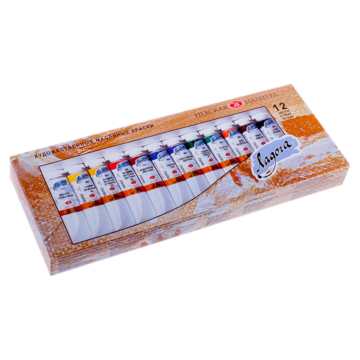 Состав набора: белила цинковые или белила титановые; кадмий лимонный (А); кадмий желтый светлый (А) или кадмий желтый средний (А); кадмий красный светлый (А) или кадмий красный темный (А); охра красная или английская красная или индийская красная; кобальт синий средний (А) или голубая «ФЦ» или кобальт синий светлый (А); ультрамарин светлый; кобальт зеленый темный (А) или кобальт зеленый светлый (А); виридоновая зеленая или зеленая «ФЦ»; сиена натуральная или охра светлая или охра золотистая; умбра натуральная ленинградская или Сиена жженая; сажа газовая или шунгит